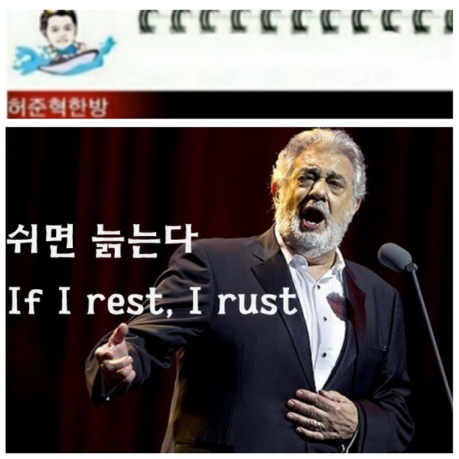 테너 플라시도 도밍고는 "이제 쉴 때가 되지 않았느냐"는 질문에 "쉬면 늙는다 (If I rest, I rust)" 라고 했다.