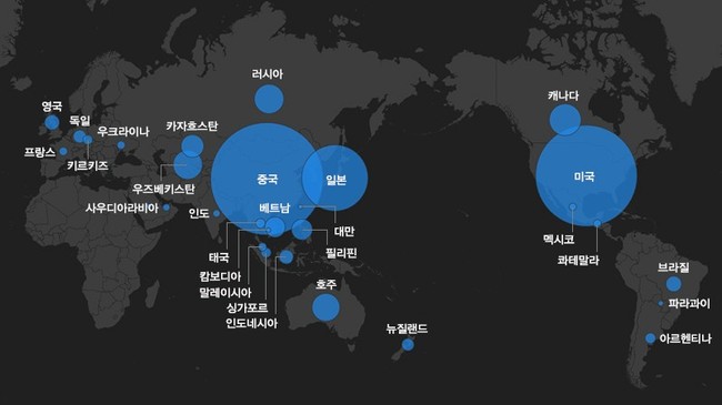 2. 동북아지역(일본, 중국)은 감소, 남아시아태평양 지역은 및 북미 지역(미국, 캐나다)은 증가, 중남미,