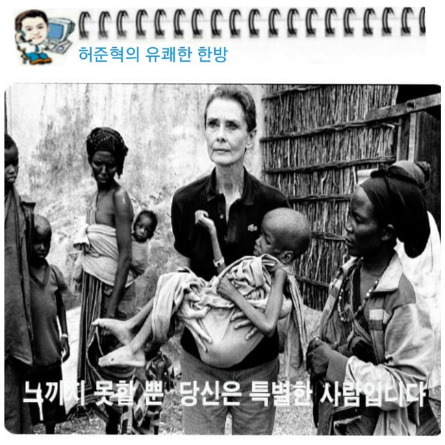 오드리헵번(Audrey Hepburn). 아름다운 외모뿐만 아니라 국제친선대사로 전 세계를 돌아다니며 사랑과 봉사활동을 한 그녀가 암판단을 받고 3개월 시한부 인생이 되었을 때 왜 자신을 희생하면서까지 아이들을 돕느냐는 질문에 대해 이렇게 말했습니다.