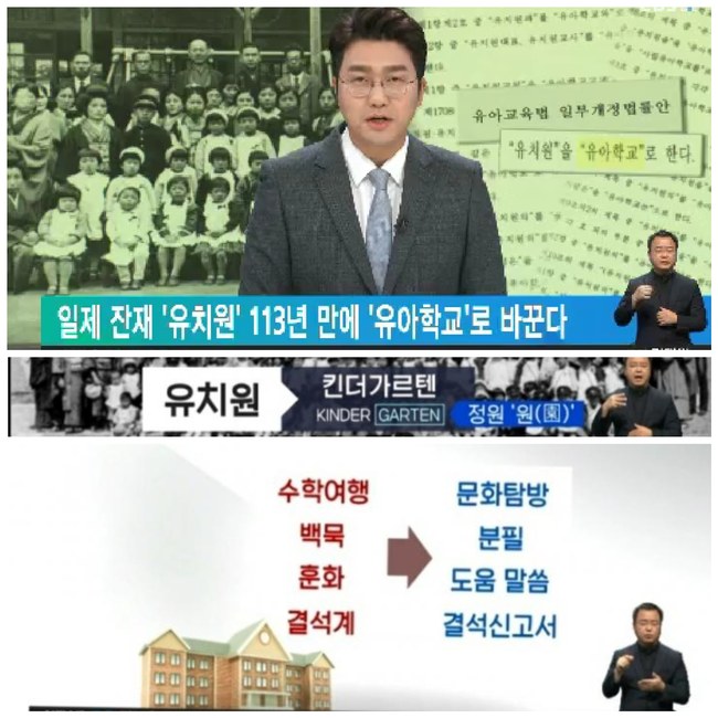 '황국신민학교'를 뜻했던 국민학교는 지난 1996년 초등학교로 이름을 바꿨지만, 1897년 일본인 자녀를 위해 처음 세워진 유치원... 당시 독일의 유아 교육기관인 '킨더가르텐'을 일본식으로 번역해 유치원이라는 부른 지 113년이나 지났다.