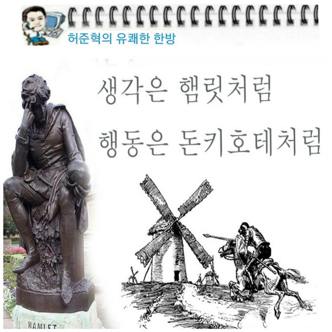 셰익스피어가 햄릿을 발표한 것은 1600년, 세르반테스가 돈키호테를 발표한 것은 1605년... 극단적으로 대비되는 두 유형이 비슷한 시기에 태어난 것은 우연의 일치일까? 햄릿처럼 생각해야할 때는 돈키호테처럼 행동하고, 돈키호테처럼 행동이 필요할 때는 햄릿처럼 생각만 하는 경우가 많다. 가장 이상적인 것은 햄릿형을 거쳐 돈키호테형이 되는 것이 아닐까... 생각은 햄릿처럼, 실천은 돈키호테처럼...