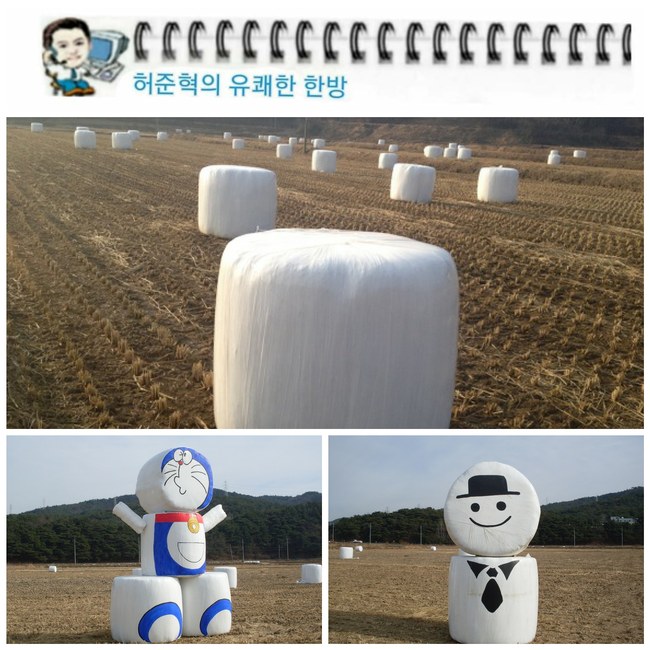 KTX를 타고가다보니 논 곳곳에 마시멜로같은게 눈에 띈다. 정식이름은 곤포 사일리지(Bale Silage, Balage)... 가을걷이가 끝나고 남은 볏짚을 돌돌돌 말아 든다(지름 1.2~1.5m, 무게 400~500㎏)