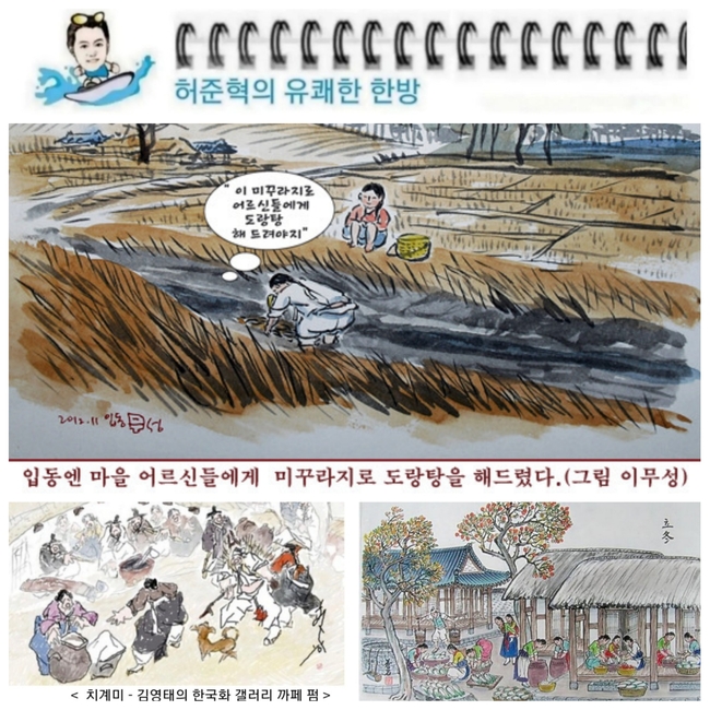 복날에 삼계탕을 먹는 것처럼 입동에는 추어탕을 먹었다. 입동의 세시풍속은 치계미(雉鷄米)... 사또에게 바치는 반찬상이나 촌지를 뜻하는 명사였지만 마을사람들이 갹출한 꿩이나 닭으로 요리를 하고 햅밥으로 마을 어르신들을 사또모시듯 대접하는 경로잔치를 뜻하게 되었다.