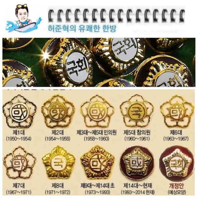 1950년 제2대 국회부터 사용되기 시작해서 무궁화 형상과 그 안의 글자가 조금씩 10차례 바뀌어 지금에 이르렀다. 1960년 5대 국회때 한자 '國' 대신 한글 '국'으로 바꿨지만 종종 거꾸로 돌아 '논'자가 되곤 하다보니, 국회가 '노는 것처럼' 비칠 수 있다는 우려에 6대때 한자로 잠시 돌아갔다.