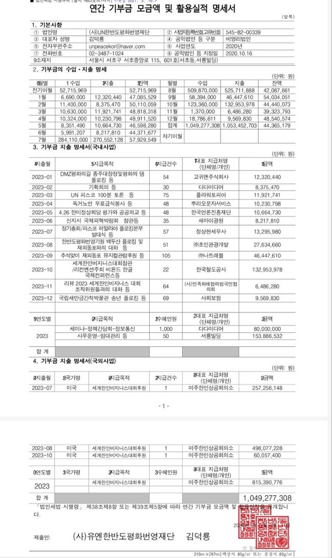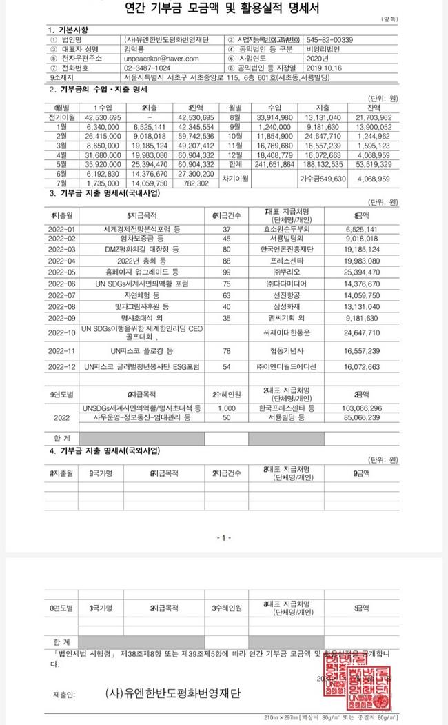 지출합계 | 1,053,452,703 | 공익목적사업비 117,000,827 공익연대국제행사후원 815,390,766 임차관리비 47,156,100 인건비 33,600,000 정보통신비 2,041,171 운영비 40,305,000 |