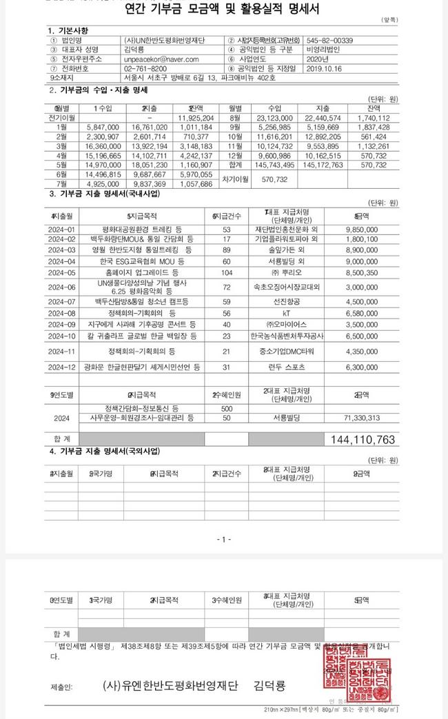 지출합계 | 144,110,763 | 공익목적사업비 52,728,350 임차관리비 42,727,205 인건비 30,000,000 정보통신비 2,041,171 운영비 16,614,037 |